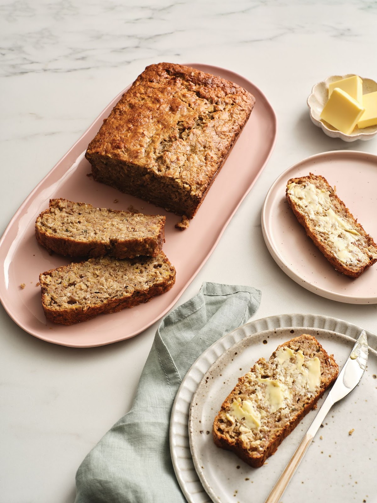 Let the banana bread cool completely before cutting or it will be too soft to hold its form. Serve with butter and honey, or as is. Store leftovers in a covered container for up to 2 days.