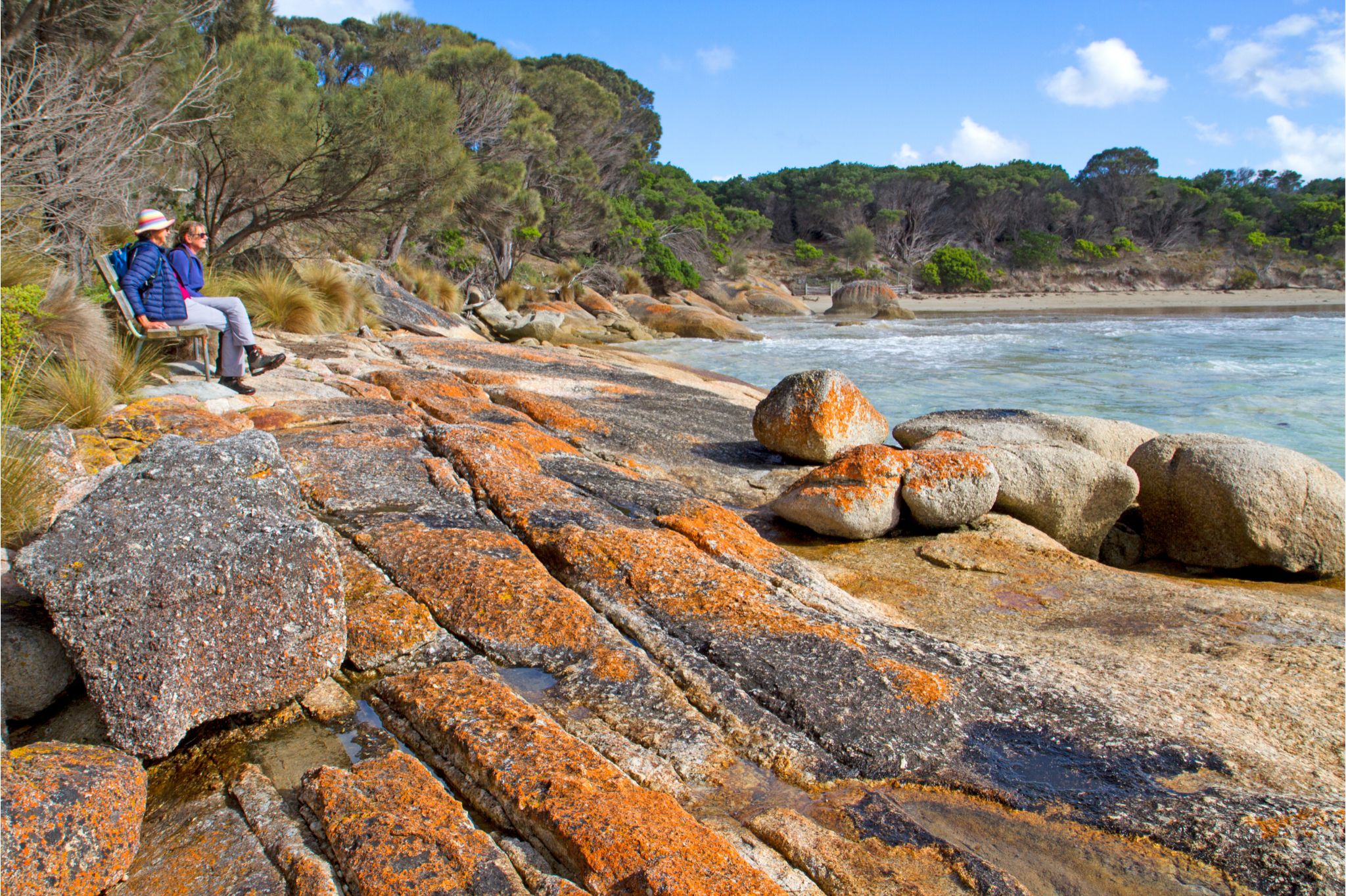 Beyond Stackys Bight, the walk exits Killiecrankie Bay and picks along the coast over massive granite rock shelves that slope down into Bass Strait.