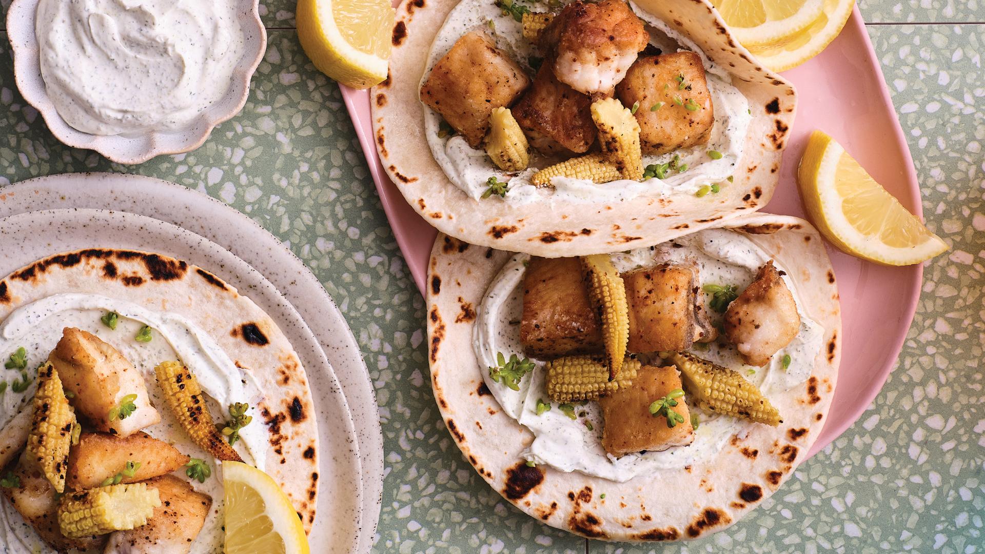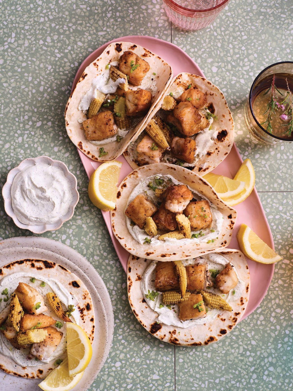 Divide the corn and the fish pieces evenly between the tortillas, and top with the lemon myrtle cream and a generous amount of seablite. Serve with lemon wedges.