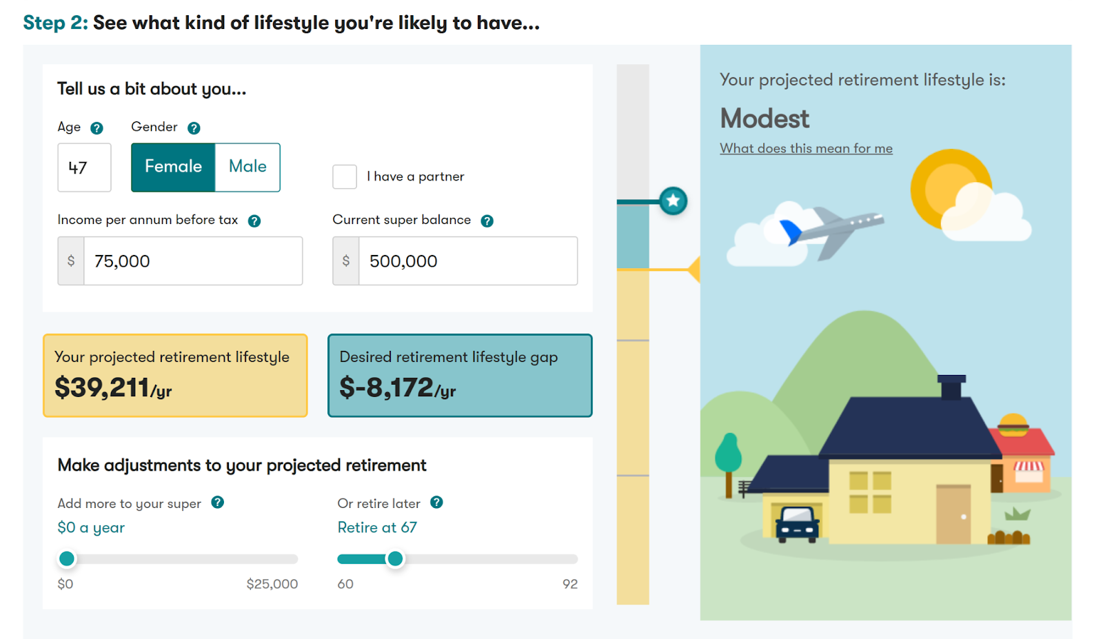 The Canstar superannuation and retirement calculator is highly visual, easy to use and though you cannot alter them, the clearly disclosed assumptions are sensible.