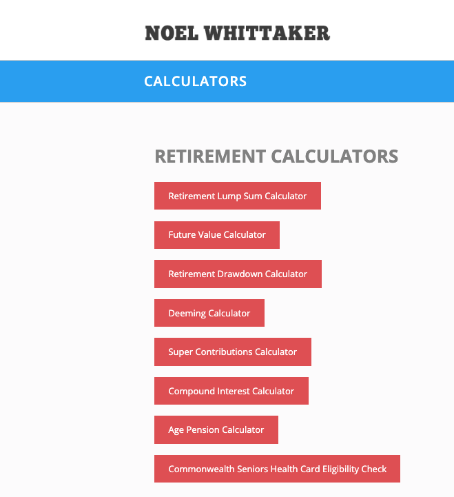 Respected personal finance author and super specialist Noel Whittaker offers multiple free calculators on his website: you have the super lump sum estimator, the super contributions calculator, the retirement drawdown calculator and an age pension calculator.