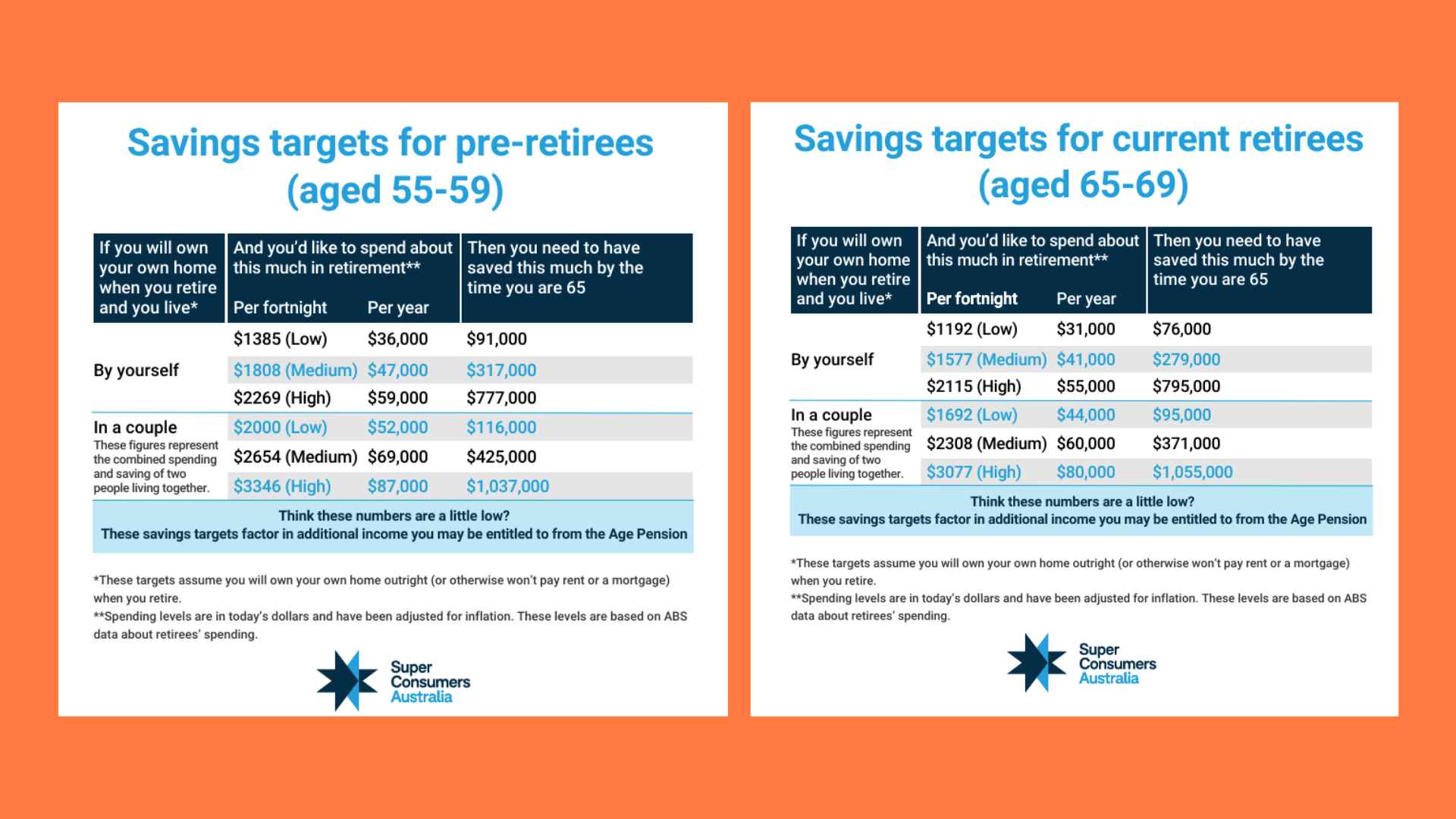 Super Consumers Australia’s Retirement Savings Targets are an independent tool to help people start to work out how much they need to save for retirement. Like ASFA, these targets assume you own your own home and crunch retirement savings goals that are based on: