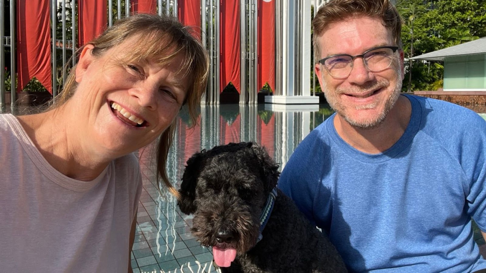 Feature image: Gretel with her husband Jason and pooch Harry, courtesy of Gretel Darby.