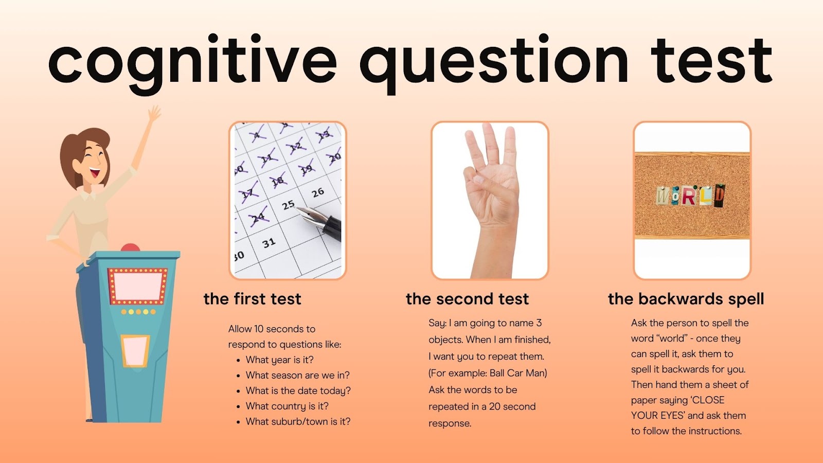 How to do it: There are basic questions to test that you know what day it is and where you are, as well as a few brainteasers that monitor comprehension. It asks you to do things that are part of normal daily life. It's important to know: