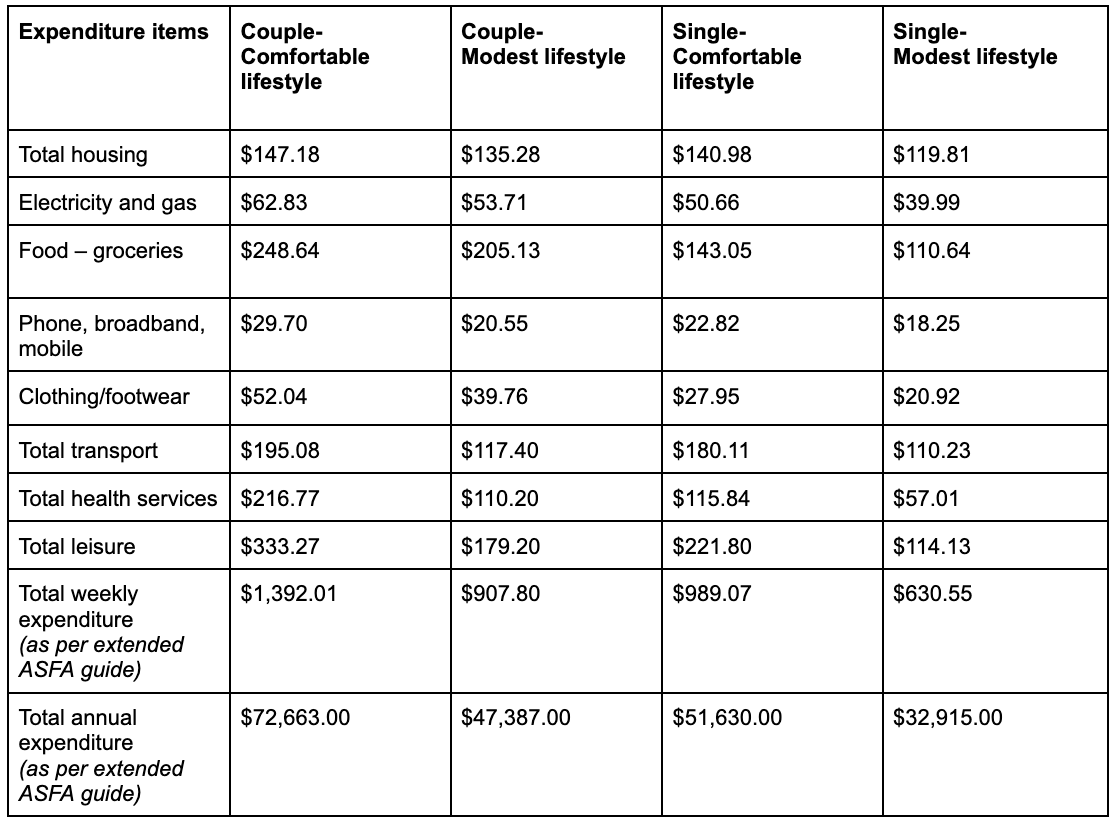 The “retirement standard” recently published by ASFA’s Research and Resource Centre, based on figures gathered in the first quarter of 2024, suggests that a retired couple aged 65-84 years old needs a joint annual income of $72,663.00 to live comfortably and $47,387.00 to live modestly.