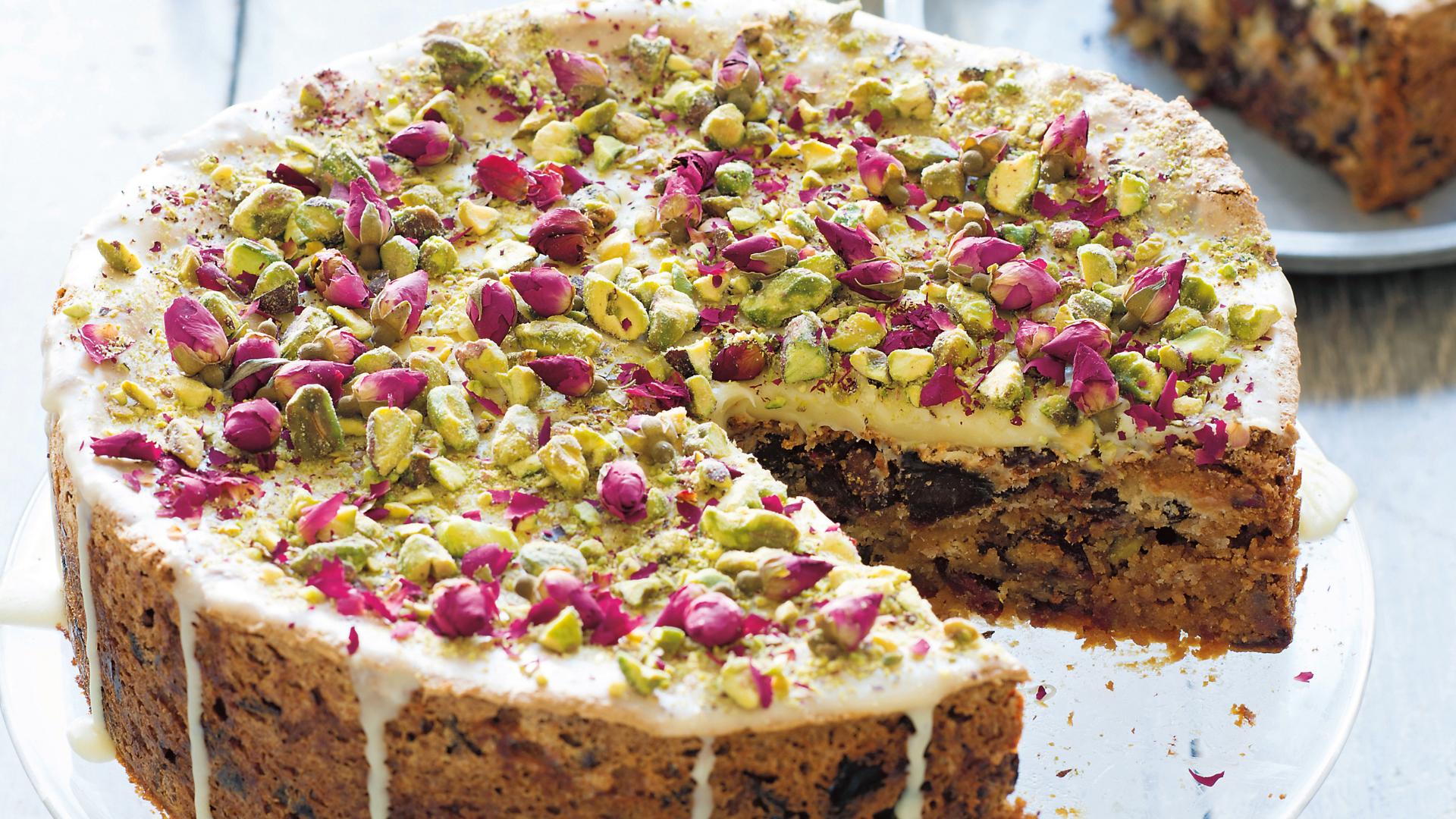 When ready to serve, remove the springform ring and spoon the glaze over the pavlova. Scatter over a Middle Eastern garnish, such as shaved halva, chopped pistachio nut kernels, pomegranate seeds or rose petals dusted with sugar, if desired.