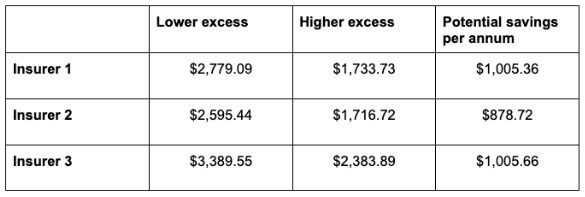 To give you an idea of how much your premiums could be reduced, I got a quote from 3 large insurers to compare how much the premiums for comprehensive insurance would be for a random luxury family SUV car if I took on a higher excess. I based this using the lowest and highest excesses offered in an online quote – this varied insurer to insurer, ranging from $450-600 lower excess to $1750-2,000 higher excess. Here are the resulting savings: