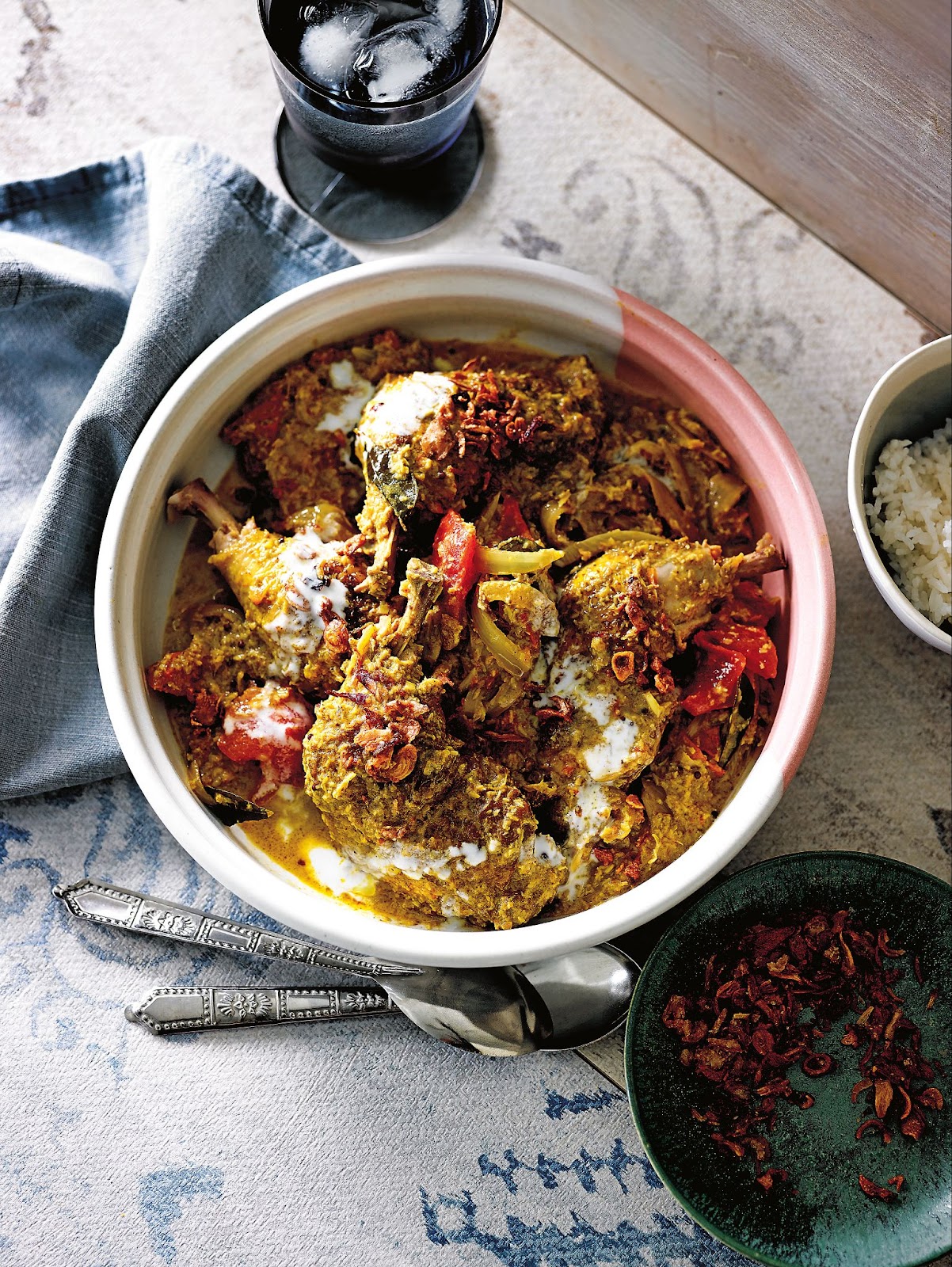 Bring to a simmer, then cover with a lid and reduce the heat to low. Cook for 45 minutes until the chicken is tender. Serve the curry with crispy fried shallots, coconut cream and basmati rice.