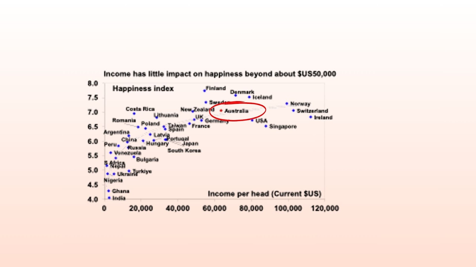 The next chart compares income levels and happiness across countries. At low levels of income, extra income can have a big positive impact on happiness. But for countries beyond a certain level (around $US50,000), extra income has little impact.