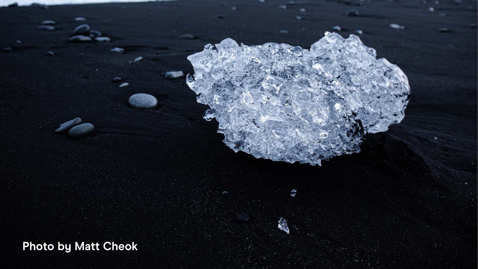 On the black sand of Diamond Beach, scattered iceberg fragments rest on the shore and glimmer in the sunlight.