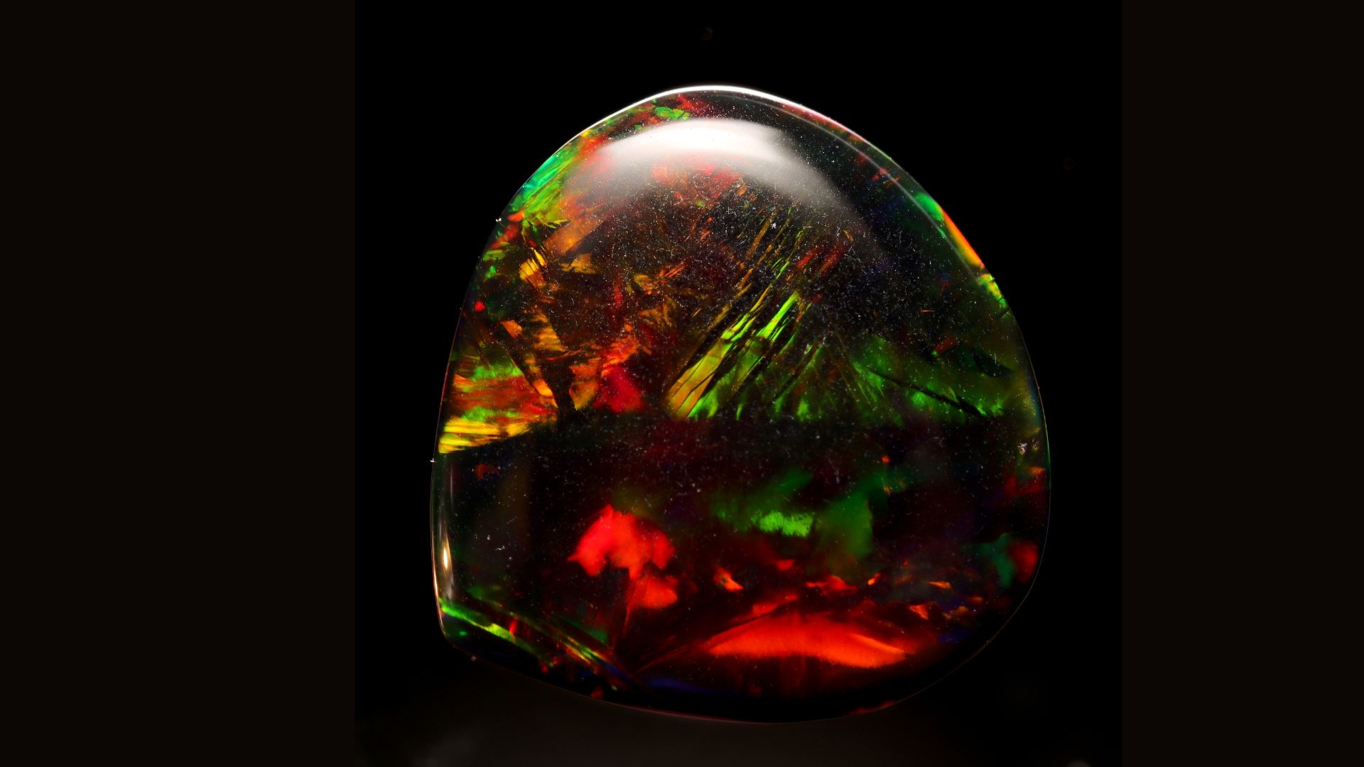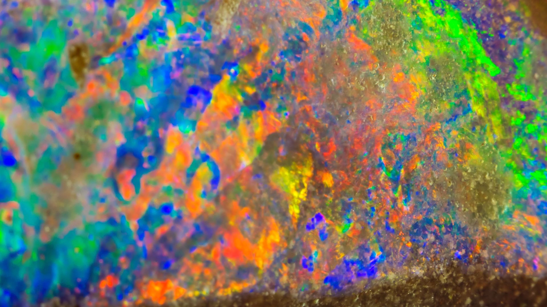 Precious opals – as opposed to common opals that don’t have the vibrant colour – display fantastic variations in colour, as light is diffracted by the thousands of minute silica spheres within them.