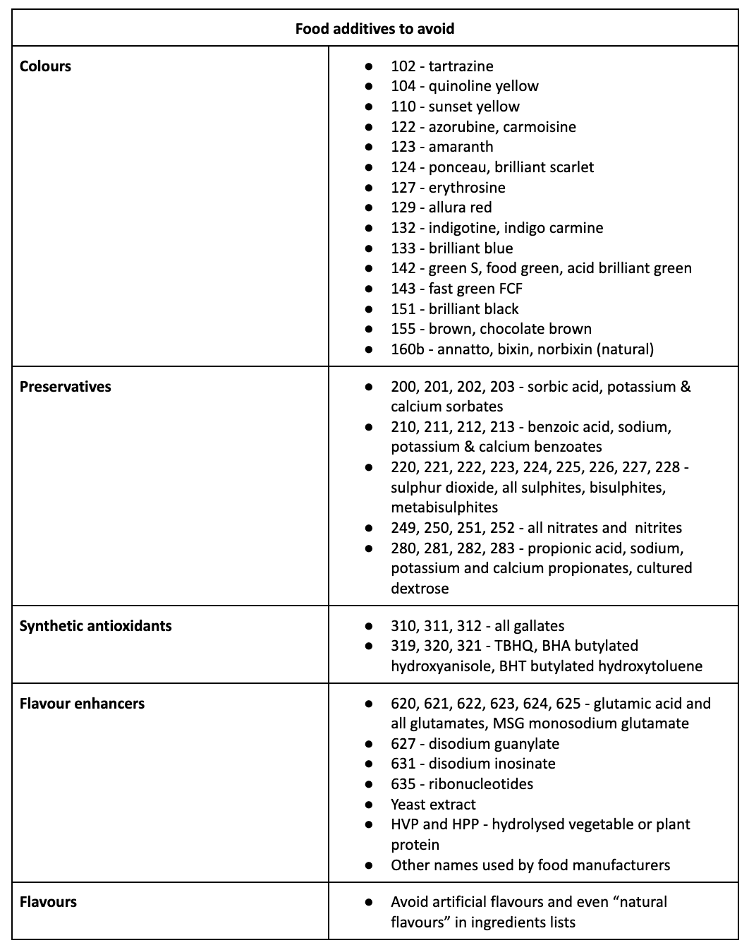 Because food additive names vary from country to country, she recommends that Australians avoid the following ingredients on food labels and consult the FedUp website for more information.